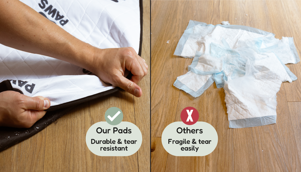 Unlike single-use pads, ours is MUCH more durable and tear resistant. Plus with piped edges, you can have piece of mind that your puppy won't shred or eat the material!